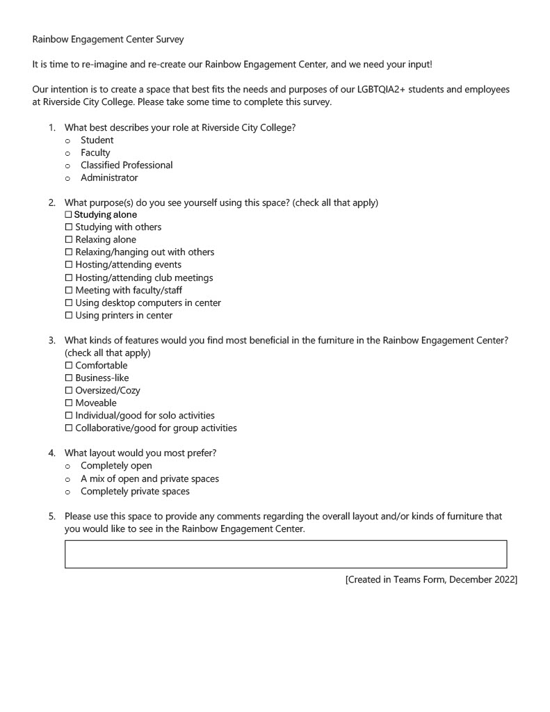 Advocate for a permanent center. This might be established directly through Facilities, at the Request of the President, through an annual Funding Prioritization process, or from a Board of Trustees Resolution. Once a center is established, conduct surveys and focus groups for the name of the center, how students will utilize the center and what they need from it, the “vibe” of the center through décor, etc. Use that to create intentional, student-centered space.