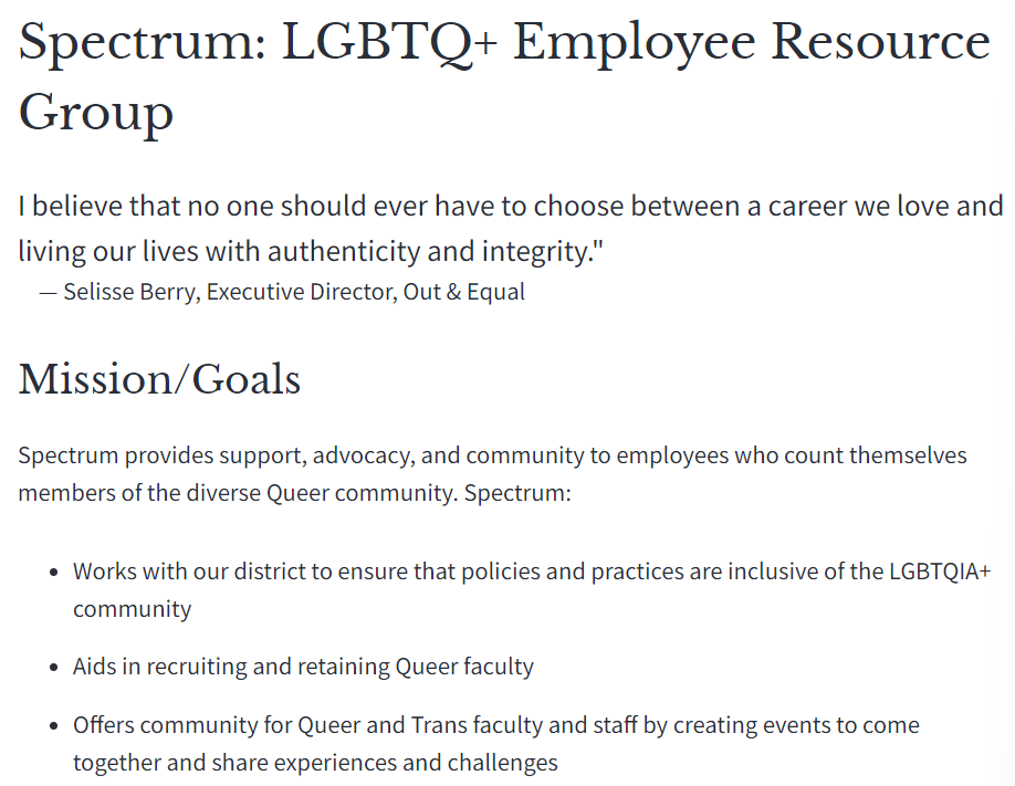 While not directly specific to trans and non-binary student support, this work can get tiring, especially for those that are one of only a few people doing this work on a particular campus. Maybe even one of the few openly LGBTQIA+ employees on that campus at all. Having a queer and trans-affirming space for employees can help reduce burnout by building community and boosting support for each other. This group can also serve to share resources and information about employee benefits, such as medical benefits or family planning and parental leave. An employee resource group can also foster opportunities for mentorship or professional development, developing a pathway for career advancement for trans and non-binary employees.